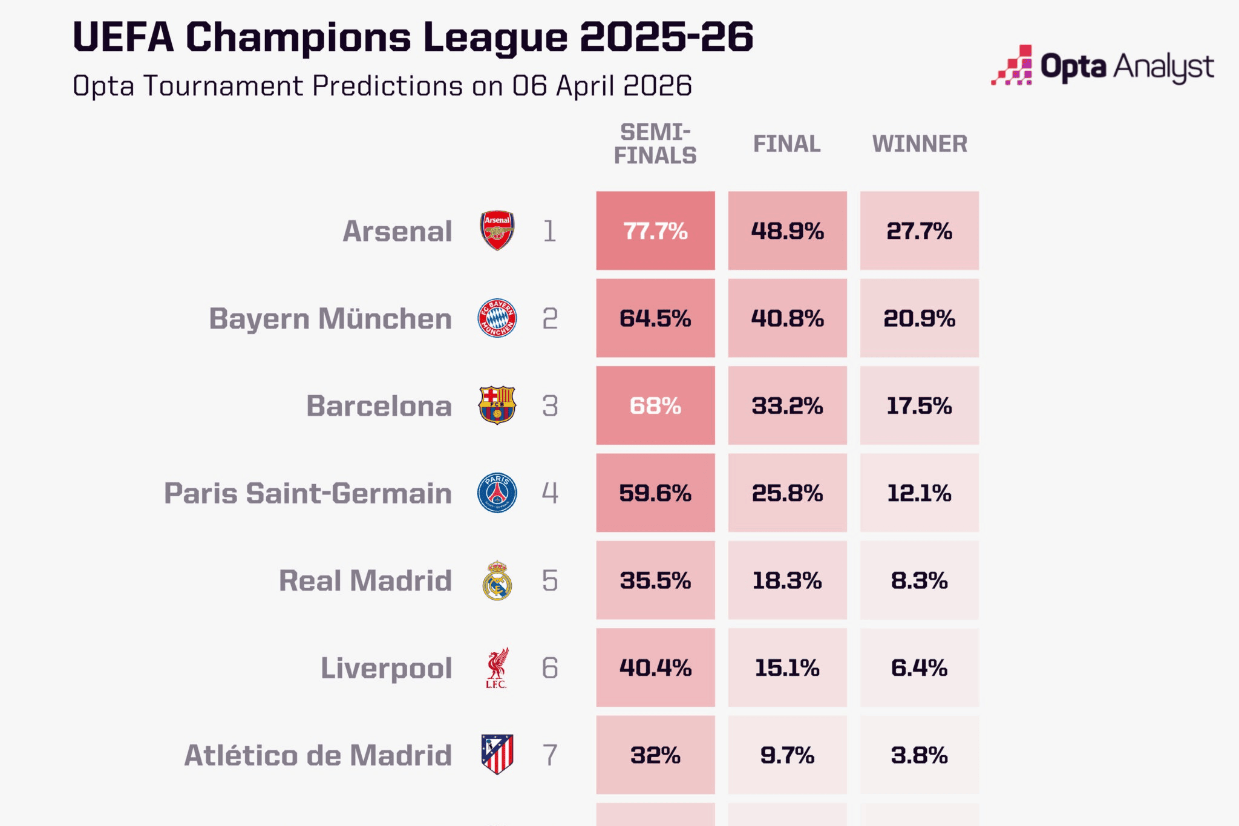 Opta模拟欧冠八强夺冠概率:阿森纳力压拜仁、巴萨,仍为冠军热门