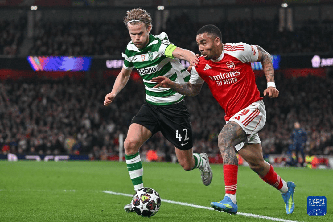阿森纳球员热苏斯(右)与葡萄牙体育球员尤尔曼拼抢(图据新华社)